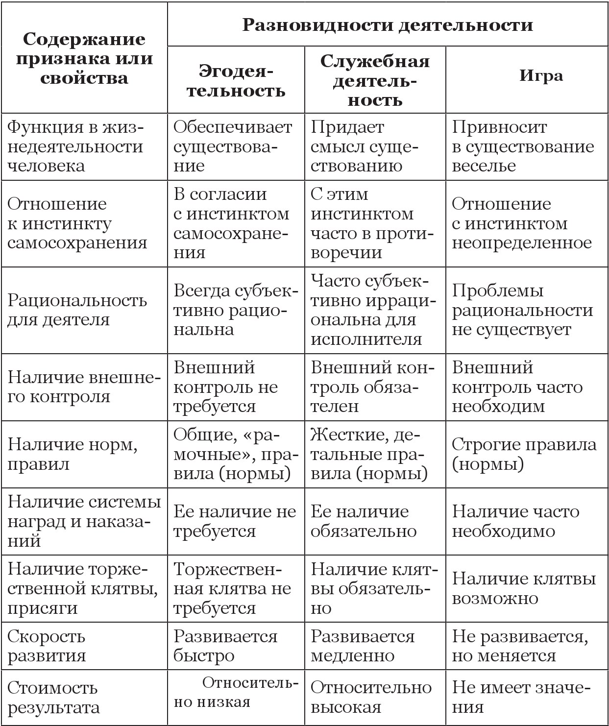 Во второй содержательной строке таблицы дано соотношение разновидностей деятельности и инстинкта самосохранения. Очевидно, что эгодеятельность находится с ним в согласии, ибо этот инстинкт также направлен на обеспечение существование. Понятно также, что служебная деятельность часто находится с ним в противоречии. Служение имеет своей целью существование некоего «другого» и требует от деятеля самоумаления, вплоть до самопожертвования. Что касается игры, то ее отношение к инстинкту самосохранения является неопределенным, ибо игра иногда принимает форму состязания, проигрыш в котором влечет смерть [Хейзинга, 1992, с. 87–92 и др.].