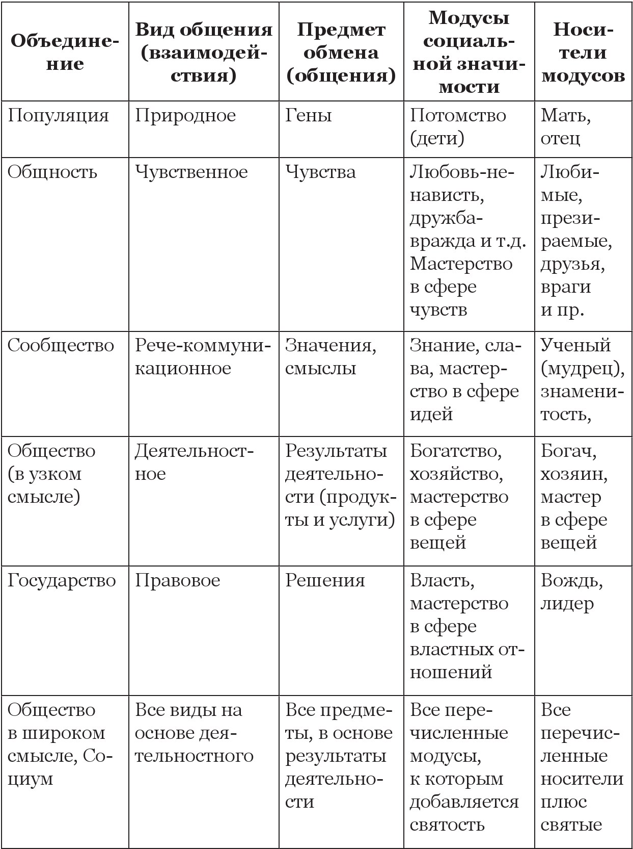 В первом столбце таблицы представлены абстрактно выделенные (на основе ведущих видов общения) объединения людейВо втором – соответствующие виды общения. В третьем столбце указаны предметы общения (обмена). В четвертом приведены модусы социальной значимости в объединениях. В пятом столбце названы носители модусов, присутствие которых служит эмпирическим признаком наличия в обществе тех или иных модусов.
