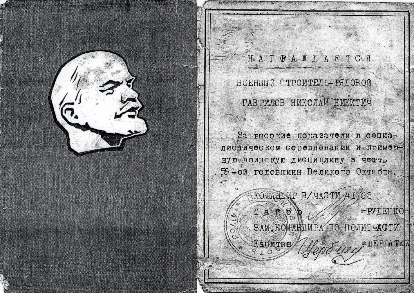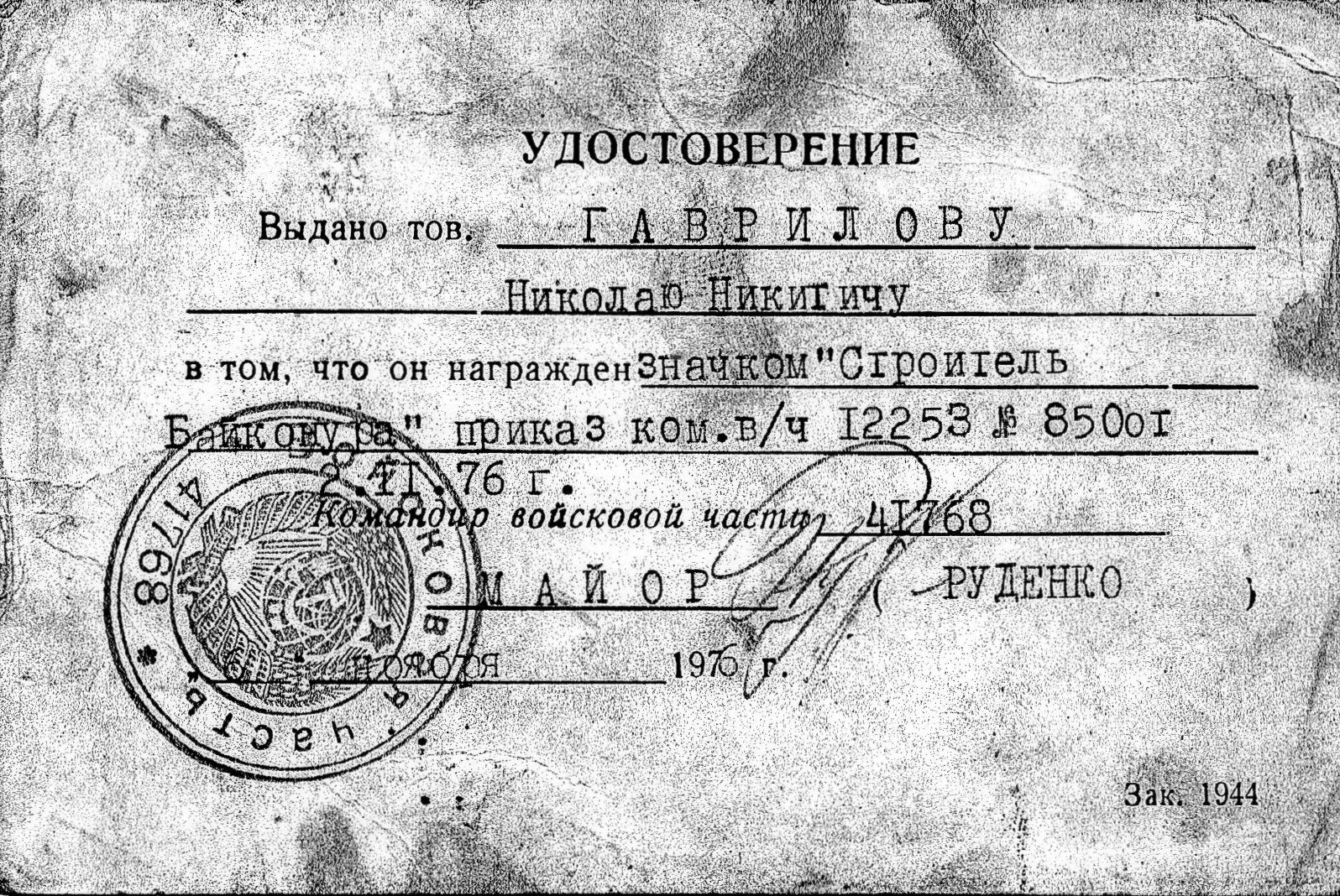 Осенью в ноябре 1974 года Вурнарским райвоенкоматом был призван на действительную военную службу. Его служба проходила на космодроме Байконур в войсковой части 41768 в качестве военного строителя. Жизнь военного строителя нелегкая, притом вдвойне, тут и служба, и ударная работа. В части всегда был порядок и железная дисциплина, требования были строгие. Летнее время работали в знойную жару за 350 С в тени и зимой в мороз за 250 С. Но военным строителям все было по силам, преодолевали все тяготы – физические и погодные. Во время службы Николаю несколько раз приходилось увидеть запуск боевых и космических ракет. Это неописуемое зрелище. Служба в строительных частях с ноября 1974 по ноябрь 1976 годы прошли на должном уровне. За хорошие показатели и примерный труд Н.Н.Гаврилов был награжден нагрудными знаками «Отличник военного строительства», «Строитель Байконура». За высокие показатели в социалистическом соревновании и примерную воинскую дисциплину в честь 59-ой годовщины Великого Октября был награжден Почетной грамотой командованием войсковой части.