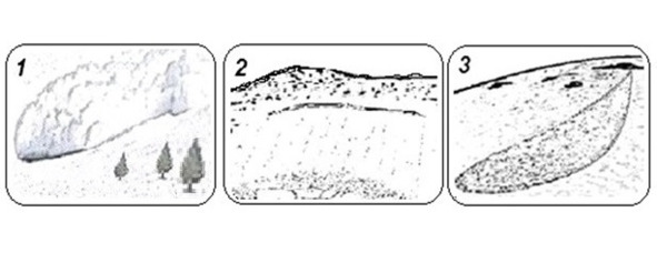 Рис. 1. Сухие лавины. Рис. 2. Лавины из пластового снега. Рис. 3. Мокрые лавины.