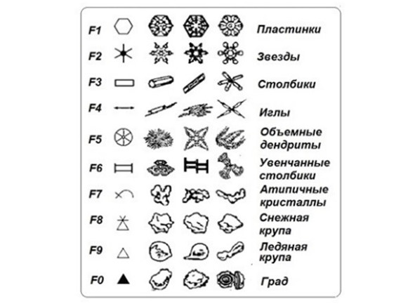 F3. Столбики – сплошные или полые снежные шестигранные призматические кристаллы, которые могут также быть в виде комбинации пирамид и призм. Их максимальный размер достигает нескольких миллиметров.