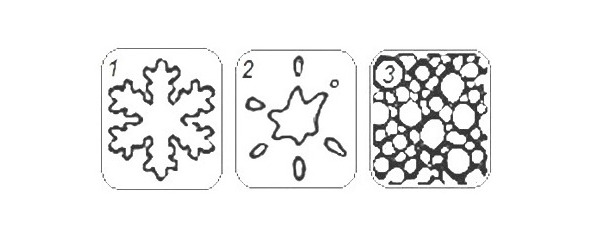 – свежевыпавший рыхлый «дикий»: он же несвязанный, очень текучий, игольчатый, пластинчатый, звездчато-пластинчатый и т. д. (𝛼1)