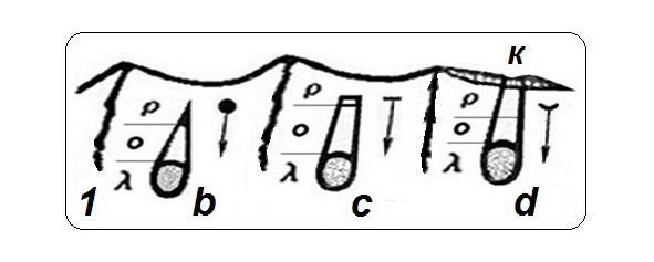 Рис. 1 Неканализованные снежные лавиносборы: b – лавины из рыхлого снега; с – лавины из пластового снега; d – лавины из блочного снега (карнизные они же обвальные); Зоны неканализованных снежных лавиносборов: 𝜌) зона старта, о) зона транзита, 𝜆) зона складирования.