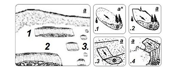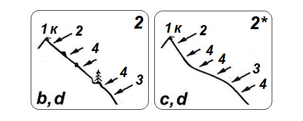 Рис. 2. Рис. 2*. Расположение зон старта снежных лавин: 1-я она же вершинная или «к» – карнизная; 2-я она же предвершинная; 3-я она же перегибная; 4-я она же локально-аномальная;