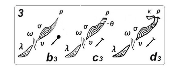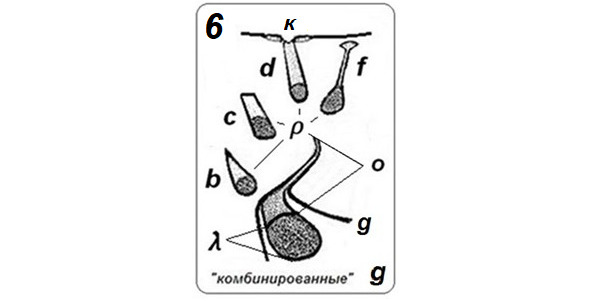 Рис.6. Устройство комбинированных лавиносборов: 𝜌 – зона старта и 1-я часть пути лавин b, c, d (к), f; о – 2-я часть cнежного пути на дне долины; 𝜆 – зона лавинных отложений на дне долины.