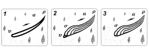 Лавины из свежевыпавшего сухого рыхлого снега: Рис. 1. Текучий поток; Рис. 2. Частично распылившийся текучий поток. Рис. 3. Полностью распылившийся текучий поток.