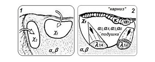 Хребтовые (𝜒1) и отроговые (𝜒2) снежные подушки состоят из снежных накоплений перераспределенного перенесенного снега: