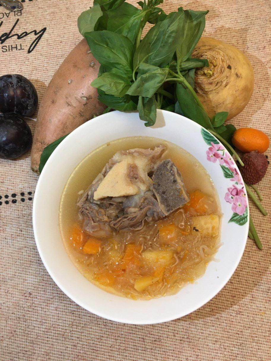 Суп, томленый в духовке с мозговой говяжьей косточкой, голенью индейки.