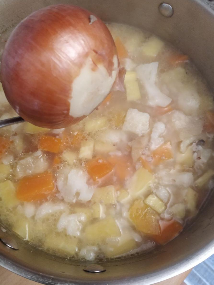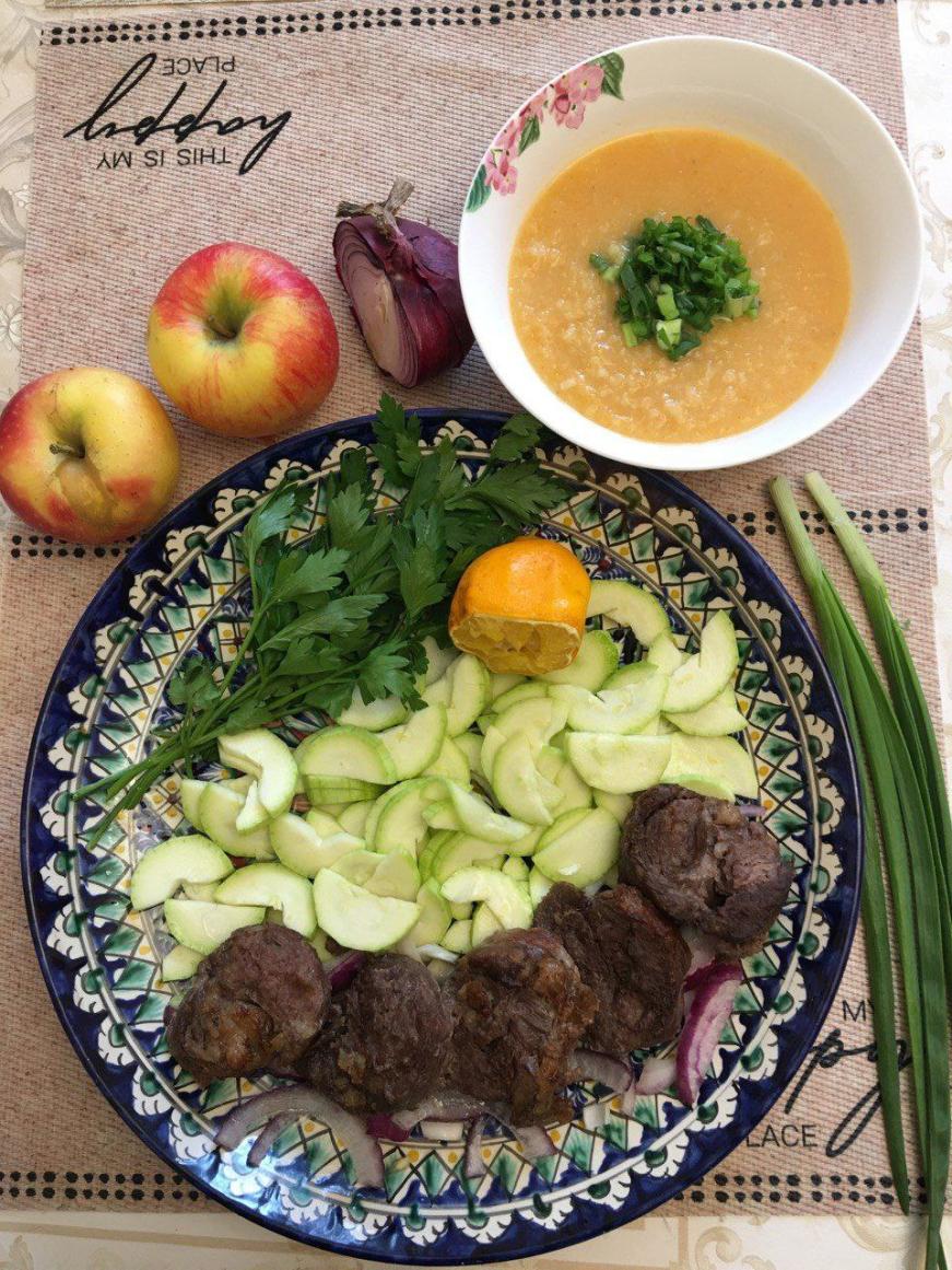 Пряный суп из казылыка с бататом, репой, корнем сельдерея, тыквой, кабачком и цукини.