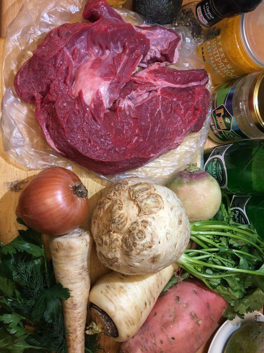 Рядом ставим большую миску с кусками мяса и вареными корнеплодами.