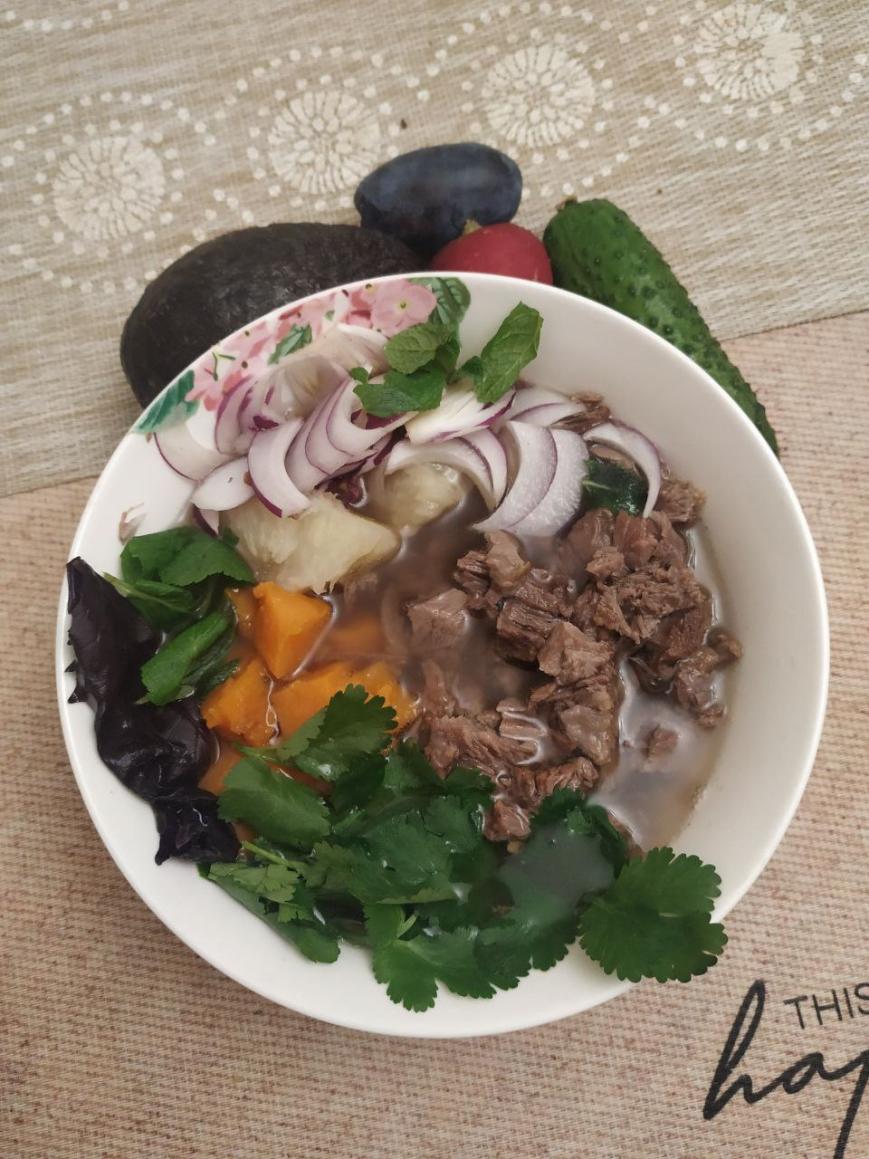 Суп из батата и зеленого лука на бульоне из костей индейки, запеченая говядина (шея) на подушке из лука