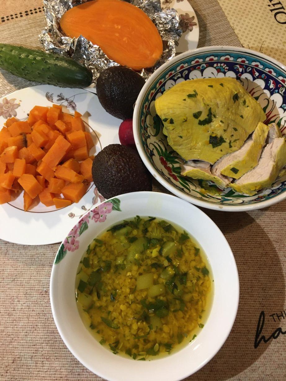 Яркий суп из тыквы, красной чечевицы и мяты плюс запеченная голень индейки.