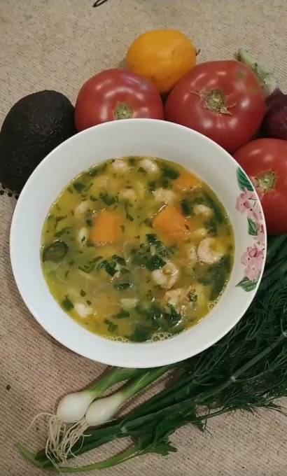 Суп из северных креветок с зелёным перцем халапенью, чесноком, петрушкой, зелёным луком и рисовой лапшой на курином бульоне.