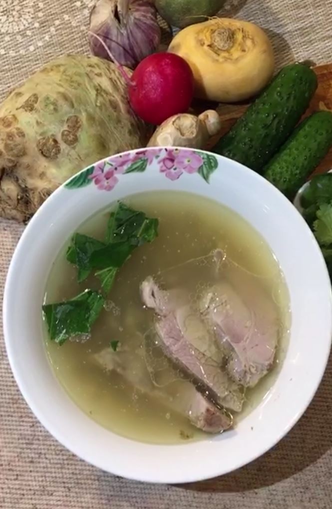 – В в пиалу на дно на листья мяты и базилика выжимаем ложку лимонного сока (абхазский лимон), кладем тончайшие слайсы или соломку свежей редьки (редиса), пару колечек красного репчатого лука, мелко порезанную зелень и наливаем кипящим бульоном.