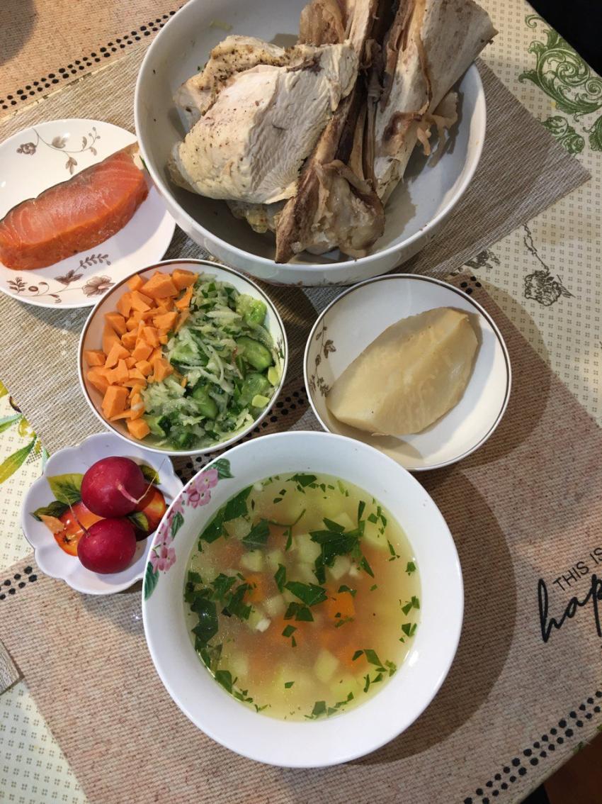 Сборный суп из говяжей мозговой косточки, грудки индейки, тыквы и кабачков.