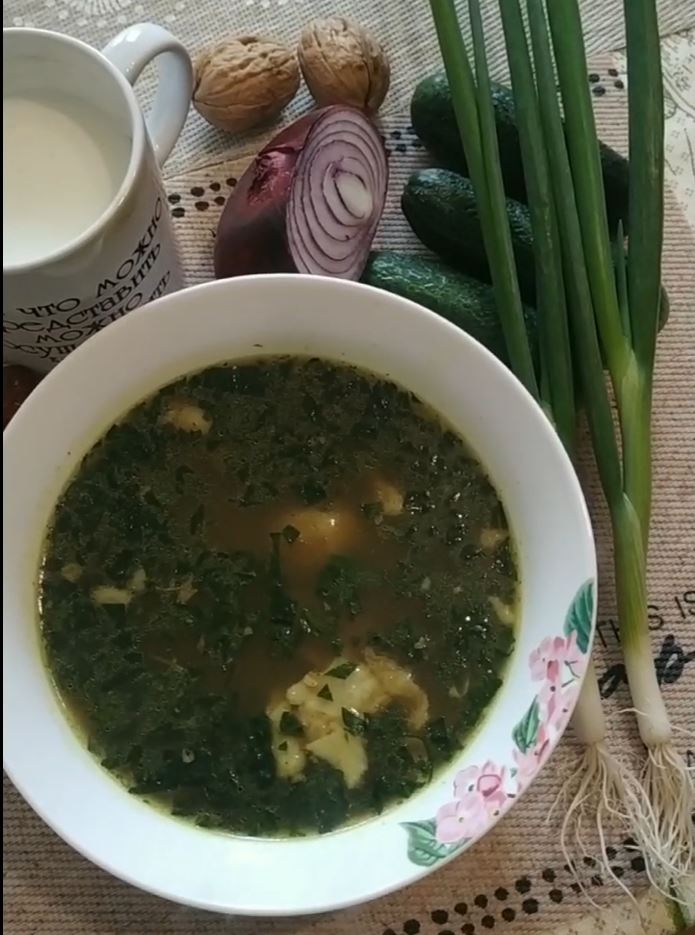 – Нарезаем мелко зелень и добавляем в бульон, доводим до кипения и накрываем кастрюлю полотенцем.