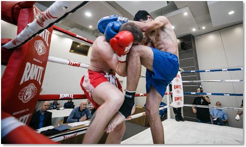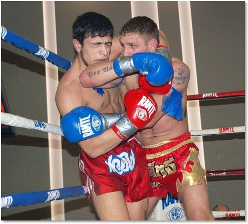 При ударах коленями тайбоксер останавливает движение вперед нижней части туловища соперника накладкой обеих рук на туловище соперника в области подвздошных гребней.