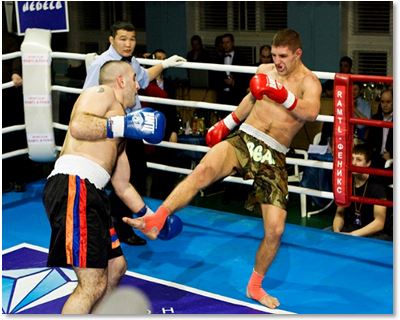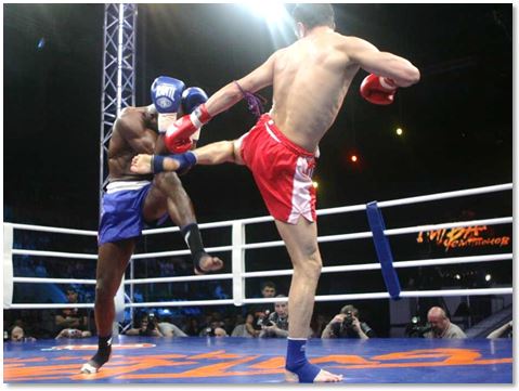 Тайбоксер подхватывает снизу возвращающуюся после толчка ногу соперника.