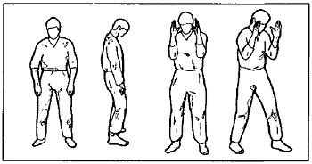 Большие пальцы ног, коленные чашечки, локти, тыльные части кистей и плечи находятся в одной вертикальной плоскости. Подбородок касается груди, таз подается вперед, живот втянут. Эта стойка рамкой вниз или нижняя рамка. Здесь рамка образуется предплечьями Проверить правильность стойки можно у стенки. Большие пальцы ног, коленные чашечки, локти, тыльная сторона ладоней и плечи должны касаться стенки. Из этой стойки легко перейти в стойку рамкой вверх или же верхнюю рамку. Для этого, согнув локти, поднимите ладони так, чтобы большие пальцы рук (ладони обращены друг к другу) были на уровне глаз (рис. 1).