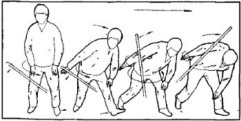 Волна скручивания левой руки переходит на правую и передает точку контакта палки с телом на правое плечо. Плечи при этом сходятся лопатками максимально близко друг другу, голова опущена вниз. Начинаем скручивание правой руки, а поступательное движение руки идет по ходу палки вправо.