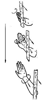 ТРЕТИЙ ВАРИАНТ (рис. 8): этот прием есть продолжение второго варианта. После положения рамки сопровождение передается на внешнюю поверхность плеча, а в это время предплечье опускается вниз и палка соскальзывает с плеча на предплечье. В конечном положении правая рука обращена ладонью назад.
