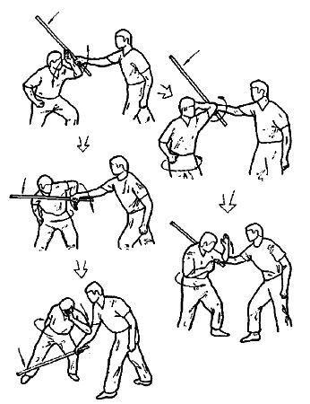Вектор силы находится в вертикальной плоскости и направлен сверху по окружности, описываемой свободным концом палки. Возможны несколько вариантов защиты в случае, когда Вы находитесь на середине палки и стоите на месте: