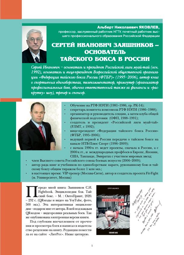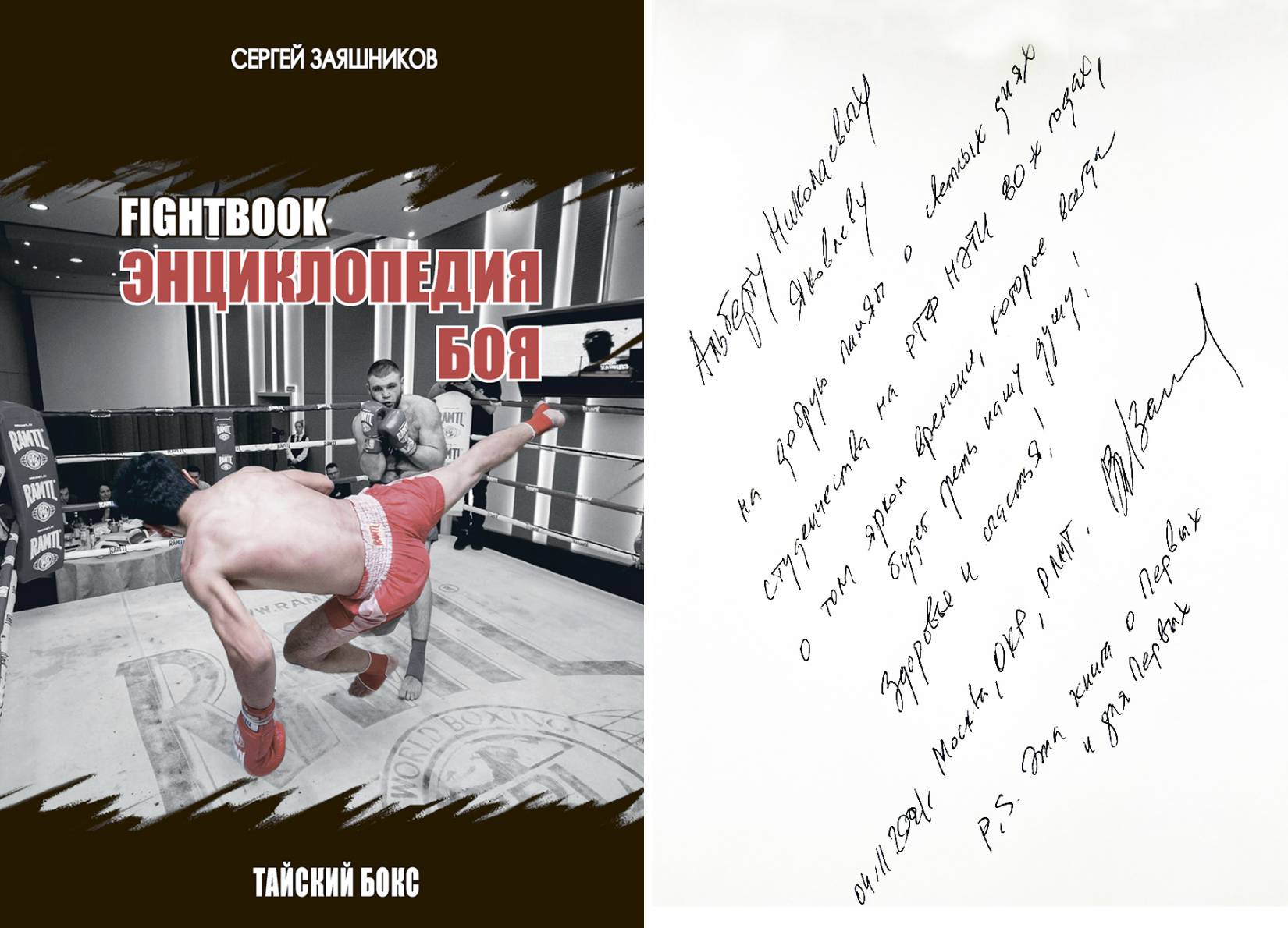 Передо мной его книга «Заяшников С.И. Fightbook. Энциклопедия боя. Тайский бокс. – М.: Изд-во «ОнтоПринт», 2020. – 232 с. QR-коды и видео на YoyTube, фото, 500 экз.» ( ЛитРес). Эта интерактивная энциклопедия подарок мне от автора. В ней под каждым QR-кодом видеоролики реальных боев. Также опубликована электронная версия книги.
