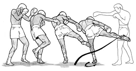 смещается на левую ногу с одновременным движением вперед-вверх правой ноги, согнутой в коленном суставе, и выведением вперед правого плеча. Как только правое бедро оказывается направленным вперед, правая нога разгибается в коленном суставе, посылая стопу вверх-вперед к цели. Увеличению силы удара способствует движение тазом вперед.