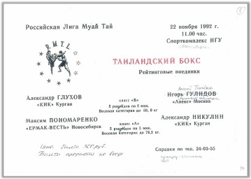 26 июля 1992 г. в Новосибирске была создана профессиональная Российская Лига Муай Тай (АОЗТ «РЛМТ», владелец и спонсор Сергей Заяшников, см. данные об организации). См. стр. 506 – отзыв Сергея Стафеева. Смотреть плей-лист на YouTube.com →