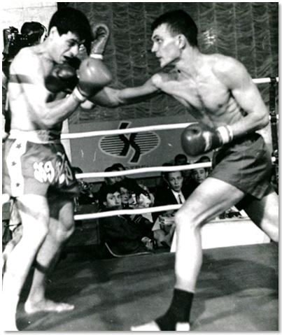 3. Скачковый прямой удар правым кулаком наносится с дальней дистанции. Для того чтобы сблизиться с противником, боксер перед ударом делает скользящий скачок вперед на правой ноге, подобный скачку толкателя ядра: перенеся вес тела на правую ногу и несколько отклонившись назад, боксер подскакивает на правой ноге и приземляется на правую же ногу.