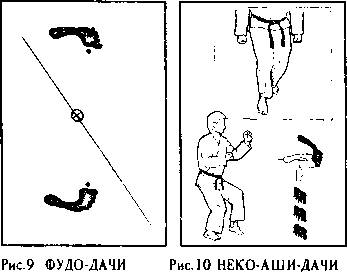 хачиджи‑дачи – стойка с расставленными ногами (рис. 3); тейджи‑дачи – Т‑образная стойка (рис. 6); хейко‑дачи – стойка с параллельно поставленными ступнями (рис. 5) и др. Кроме шизен‑тан, существуют другие стойки, такие как: зенкутцу‑дачи – передняя стойка (рис. 12); кокутцу‑дачи – задняя стойка (рис. 7); киба‑дачи – стойка всадника (рис. 8); фудо‑дачи – прочная стойка (рис. 9); некоаши‑дачи – кошачья стойка (рис. 10); санчин‑дачи – «песочные часы» (рис. 13); хангетцу‑дачи – стойка «полумесяца» (рис. 4); цируаси‑дачи – стойка цапли (рис. 14) и т. п.