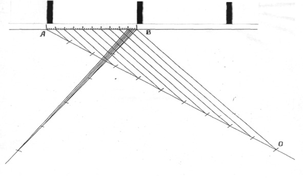 Цена 1-ого деления линейки объект – микрометра, как известно, составляет 0,01 мм или 10 мкм. Фотографии таких участков в 10 мкм после увеличения показаны на рис. 2. На одном из них строили по теореме Фалеса линейку-шкалу для измерения хромосом. Для этого из крайней точки А провели под углом луч АО, отложили на нем 10 конгруэнтных отрезков и последнюю точку О соединили с точкой В калибруемого участка. Затем параллельно прямой ОВ из остальных 9 точек луча провели линии, разделившие калибруемый участок на 10 конгруэнтных отрезков, каждый из которых соответствовал 1 мкм. Последние аналогичным образом поделили еще на пять частей и получили отрезки с ценой 0,2 мкм. Эту линейку-шкалу использовали для измерения линейных параметров хромосом.
