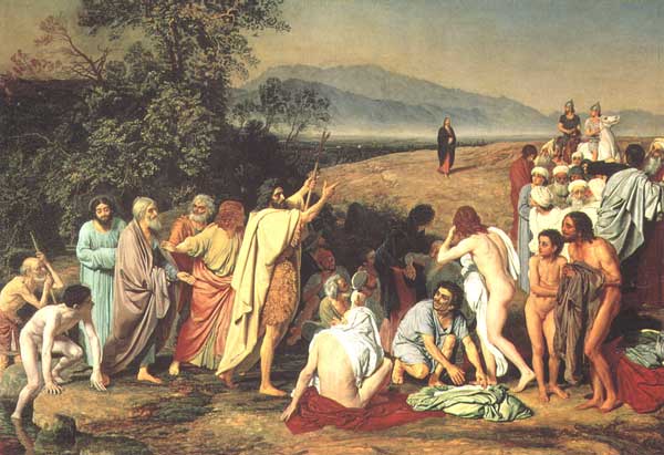 «С этою мыслью занялся я снова отысканием для себя сюжета: прислушивался к истории каждого народа климата умеренного, прославившего себя деяниями, и нашел, что выше евреев ни одного народа не существовало, ибо им вверено было свыше разродить Мессию, откровением коего начался день человечества, нравственного совершенства, или, что все равно, познать вечно сущего Бога! Таким образом, идя вслед за алканием пророков, я остановился на Евангелии – на Евангелии Иоанна! Тут на первых страницах увидел я сущность всего Евангелия – увидел, что Иоанну Крестителю поручено было Богом приуготовить народ к принятию учения Мессии и наконец лично представить его народу! Сей-то последний момент выбираю я предметом картины, т. е. когда Иоанн, увидев Христа, идущего к нему, говорит народу: „Се агнец Божий, вземляй грех мира! Сей есть, о нем же аз рех: по мне грядет муж, иже предо мною бысть, яко первее мене бе. И аз не видех его, но да явится Израилеви“. Предмет сей никем еще не делан, следовательно, будет интересен уже и по новизне своей».