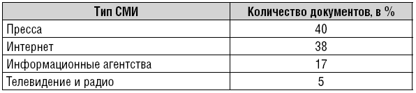 Программа исследования. Целью исследования, проведенного нами в 2011 г. и охватившего деятельность СМИ в период 2010–2011 гг.21, стало выявление текущего состояния медиаконтента, посвященного благотворительным фондам, – характеристик упоминаемости их и качественных характеристик, отраженных в категориях анализа. Формирование исследуемого массива текстов происходило на основе базы данных «Интегрум» с использованием ключевых слов и различных параметров поиска. Кластеры для сравнительного анализа (различные типологические группы СМИ) сформированы таким образом, чтобы они включали, во-первых, все медиаплатформы (информационные агентства, «бумажные» СМИ, телевидение и радио, интернет-СМИ); во-вторых – столичная и региональная пресса; в-третьих – тематически универсальные и специализированные СМИ. Для качественного анализа каждый из кластеров был представлен примерно равным количеством источников – 5–7. Итоговая выборка по 56 источникам составила 501 текст. Введение категорий анализа дифференцировало предмет анализа и позволило выявить «горячие точки» объекта. По итогам пилотного исследования смысловых элементов наиболее важными категориями анализа были определены: