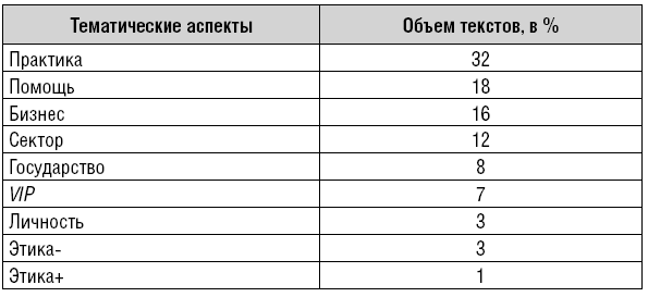 Подчеркнем: в данном случае исследовались все основные группы СМИ, представленные на медиарынке, – газеты и журналы, эфирные СМИ, региональные издания и новые медиа. Необходимо обратить внимание на различия между группами СМИ, прежде всего резкое несовпадение частотных характеристик: одни источники публикуют более 10 материалов в год, другие – один или вообще к теме не обращаются. Лидирующие позиции принадлежат газетам и интернет-СМИ: каждая по-своему, эти группы пытаются позиционировать себя «внутри темы». Газеты больше, чем другие СМИ, обращаются к аналитике; интернет-СМИ добиваются успехов в социально-организаторской и проектной деятельности. Группы-аутсайдеры темы – телевидение (негативный, но ожидаемый результат) и журналы (досадная неожиданность). Факт не следует оставлять без внимания, так как аутсайдеры обслуживают фланги и одновременно важнейшие группы аудитории СМИ: массовую аудиторию и экспертное сообщество («думающую» аудиторию). Завоевывать эти сообщества совершенно необходимо, но, по-видимому, подходы к ним еще не найдены. Промежуточное положение занимают региональные СМИ и радиостанции: содержательно проблематика здесь сбалансирована, но объем тематики явно мал. Исключение в общей массе составляют АСИ и газета «КоммерсантЪ» (частотность соответственно 23 и 7–8). Присутствуют различия и внутри групп – достаточно сравнить, например, ИТАР-ТАСС и АСИ, «КоммерсантЪ» и «Комсомольскую правду». Это означает, что на общем фоне выделяются некоторые отдельные СМИ, которые значительно продвинулись в освоении темы и могут делиться опытом и технологиями в рамках корпоративного профессионального общения.