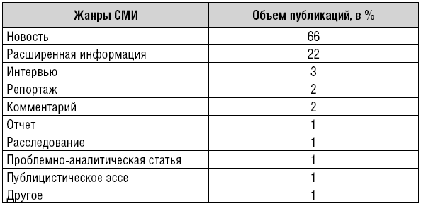 Глубинная, проблемная сторона деятельности фондов нуждается в иных подходах, в использовании других жанровых моделей. Однако СМИ тяготеют к жанровым моделям, которые считаются наиболее востребованными массовой аудиторией: новости, расширенная информация, интервью. Лишь возмутительная история с фондом «Федерация» вызвала ряд журналистских расследований. Чрезвычайно мало глубоких проблемно-аналитических статей. Просматривается интересная тенденция: в федеральных СМИ на статьи приходится 1,2 %, в то же время в региональных изданиях процент статей достаточно высок и составляет 18,2 %.