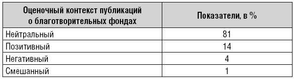 Преобладающий оценочный контекст публикаций о благотворительных фондах – нейтральный (81 %), в 16 % текстов – позитивный или смешанный и лишь в 4 % текстов – негативный, что ожидаемо и объяснимо: информационные тексты изначально ориентированы на авторский нейтралитет. Задача большинства текстов – констатировать тот или иной факт без уточнения, положительный фон у новости или отрицательный. Здесь необходимо отметить, что часто это нейтрально-позитивный контекст, так как речь идет о фактах, несущих заведомо положительный заряд. Прямо позитивная авторская оценка не высказывается – таковы законы информационных жанров, ситуация говорит сама за себя. Так что можно сделать заключение о преобладании позитивной информации в текстах. Негативный контекст содержался в тех материалах, которые рассказывали о скандалах, связанных с недобросовестностью благотворительных организаций, и неэффективностью их работы. К сожалению, лишь немногие СМИ сделали попытку переступить «порог очевидности» и рассмотреть проблематику в более сложном, проблемном контексте, с выявлением позиций сторон, не игнорируя противоречивые, спорные моменты в деятельности фондов.