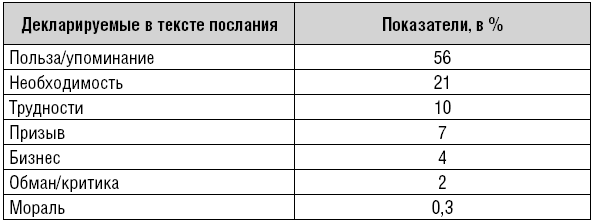 Анализ ключевых посланий – идей – сопряжен с рядом трудностей, связанных с тем, что послания далеко не всегда открыто декларируются в тексте. Особенно характерно это для текстов информационных. Идеи «прочитываются», как правило, из целостного восприятия текста. Анализ ключевых посланий показал, что в исследуемых текстах наиболее часто проявляется идея «Пользы» (56 % от общего числа текстов). Таким образом, данные тексты содержат в себе идею, ключевую мысль о несомненной пользе благотворительности обществу и сообщают об уже оказанной помощи или о том, что для помощи планируется предпринять в ближайшее время. В большинстве случаев идея пользы не развивается (что обусловлено жанром текста – информационная заметка) и определяется предъявлением в тексте самого уже свершившегося факта помощи нуждающимся теми или иными благотворительными фондами или сообщением о благотворительных акциях. (Поэтому категорию «Польза» мы сочли нужным уточнить, приняв формулировку «Польза/упомина-ние».)