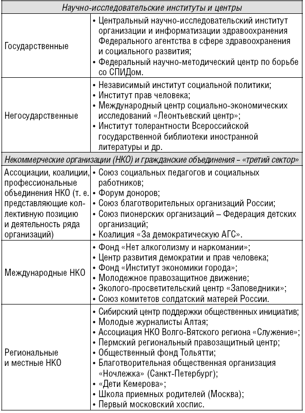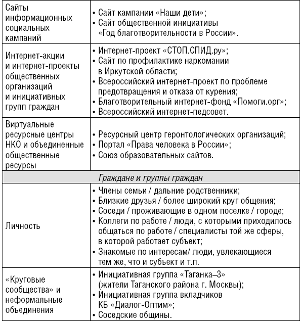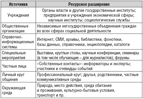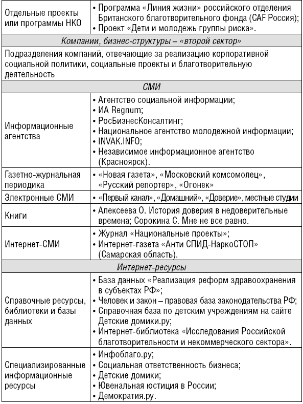 Последнее из перечисленных правил требует отдельного рассмотрения. В социальной журналистике складывается особый круг контактов, общения, системы взаимодействий. В изучении и описании этого круга источников вместе с автором принимали экспертное участие сотрудники Агентства социальной информации83. Результаты нашего анализа представлены в следующей таблице: