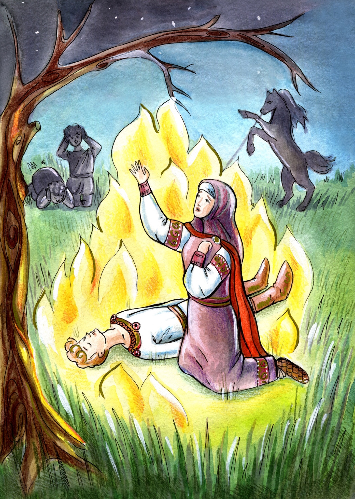 – Золото не возьмёте, убить меня задумаете? Род мой здесь завтра же окажется. И будет вас преследовать, пока последнюю собаку не распотрошит, мои косточки искаюче, – сурово молвила разъярённая мать. Да и я, со своей стороны, в окаянные души метнусь, но вас теснить стану, пока до Адова круга не доведу. До судилища Божьего! – и сварожьими знаками окрестясь, трижды стрибожьим символом омовясь, произнесла слова боли страшные, и из глаз материнских не слезы полились, а искры огненные посыпались, траву сухую и платок цыганский опаляя.