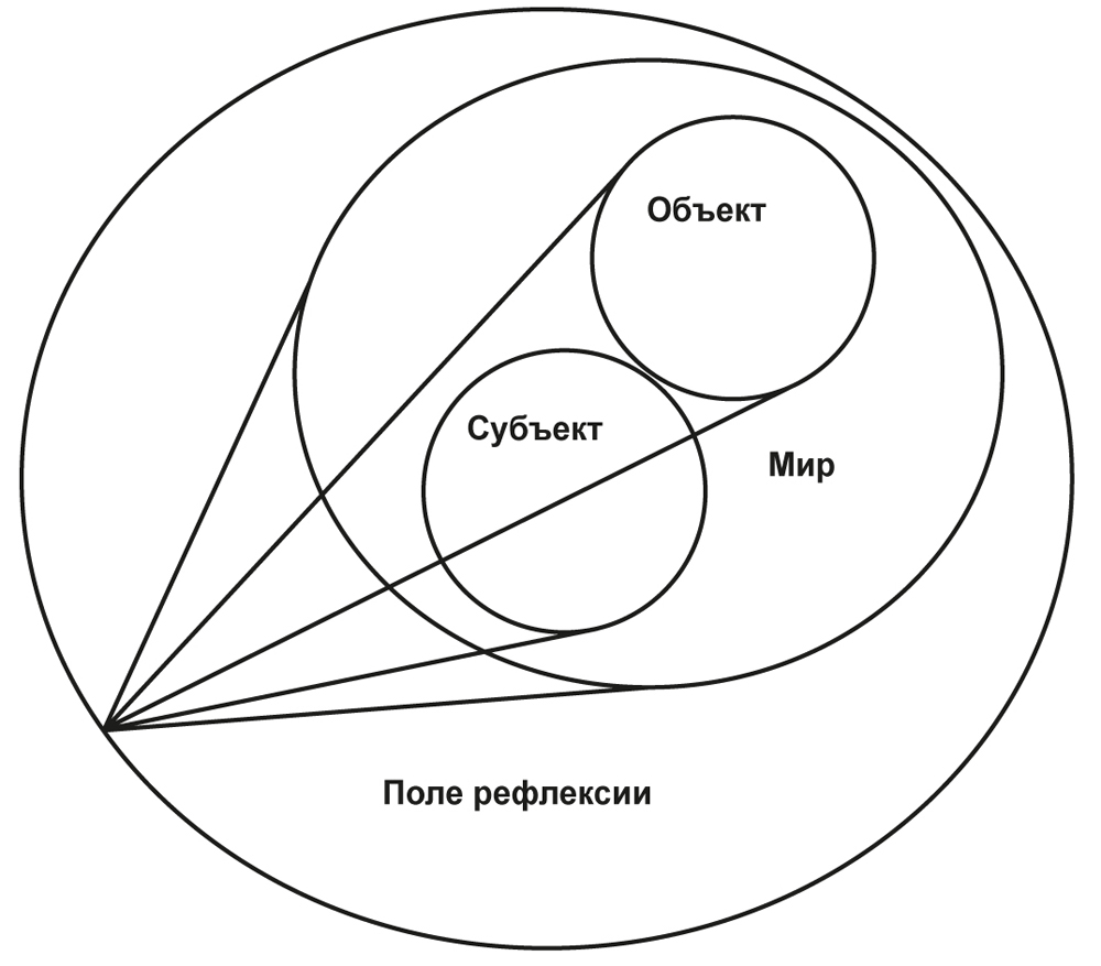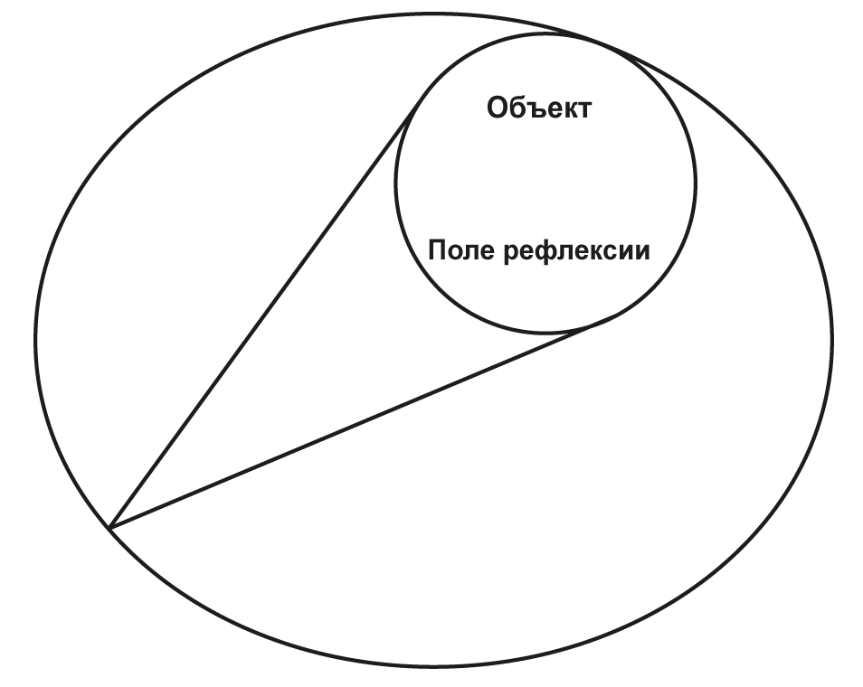 Рисунок демонстрирует свободу в выборе установочного ракурса: концентрация ли непосредственно на объекте (в соответствии с идеалом классической рациональности), на взаимодействии ли объекта и субъекта, или на взаимоотношениях объекта и субъекта, представленных в разнообразии систем (в соответствии с идеалом неклассической рациональности). Помимо этого здесь добавились, с одной стороны, множественные поля рефлексии, а с другой – обзорное поле рефлексии, где осуществляется произвольное конструирование картины мира на основе разных исследовательских ракурсов. Среди интегрирующих исследовательских стратегий наряду с вышеупомянутыми возможны: «триангуляция» (как чередующаяся смена методологической оптики) и «смешанные методы» (смена исследовательской оптики и скольжение мысленным взглядом от одного познавательного ракурса к другому). Сочетание ракурсов создает новые, избыточные, иногда неожиданные и ранее не очевидные возможности. Наиболее проблематичной и одновременно креативной областью становится обзорное поле рефлексии, где решаются задачи синтеза и интеграции исследовательских стратегий.