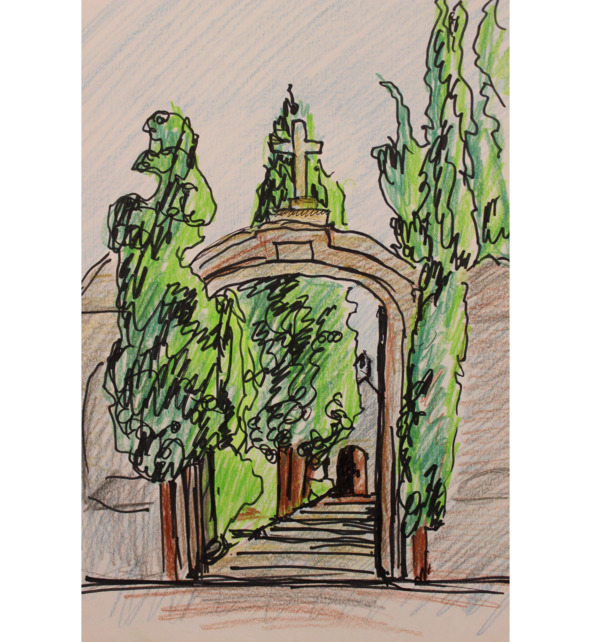 Тут начиналось кладбище. Абсолютно белая, как будто только что выкрашенная стена создавала трагически-классический контраст с черными железными воротами. Два можжевельника росли по обе стороны ворот. По высоте они достигали каменного креста на арке над воротами. На самом верху были выбиты цифры – 1899.