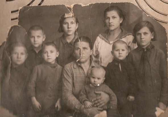 История этой фотографии печальна. Деда посадили. Бабушка осталась одна с детьми. Ей посоветовали написать Калинину и послать фотографию. Мальчики стоят в пальто, потому что у них не было штанов. Мать старшая – в матроске. Деда выпустили.