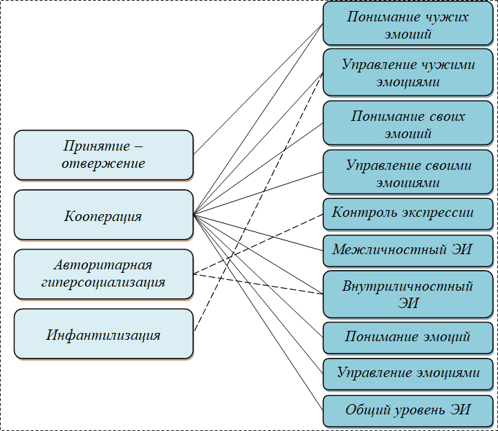 Рис. 1. Взаимосвязь между типом родительского отношения в семьях, воспитывающих особых детей, и уровнем развития эмоционального интеллекта матери