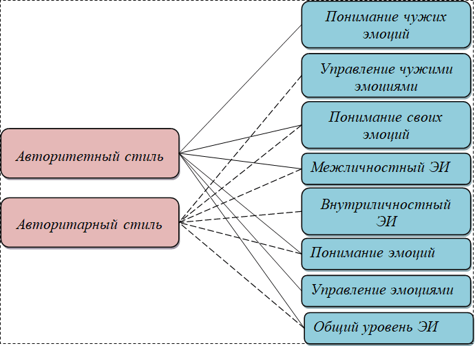 Отрицательные связи зафиксированы между авторитарным стилем воспитания и управлением чужими эмоциями, пониманием как своих эмоций, так и эмоций окружающих людей, межличностным и внутриличностным эмоциональным интеллектом, а также общим уровнем развития эмоционального интеллекта. Данные связи свидетельствуют о том, что детско-родительские отношения матерей со своими особыми детьми, которые обладают хорошо развитыми способностями к идентификации своих эмоций и эмоций других людей, а также управлению эмоциями окружающих людей, характеризуются отсутствием духовной близости и чувства привязанности друг к другу. Эти матери, как правило, четко определив для себя, каким должен вырасти их ребенок, прилагают к достижению этого идеала максимум усилий. При этом в своих требованиях они крайне категоричны и неуступчивы, а ребенок находится под постоянным родительским контролем, родители всячески ограничивают его самостоятельность и инициативу.