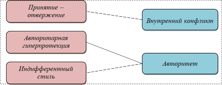 Рис. 3. Взаимосвязь между характером детско-родительских отношений, внутренним конфликтом и самооценкой матери