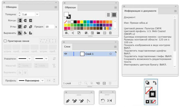 Рис. 3. Палитры, необходимые для построения чертежа конструкции прямой юбки