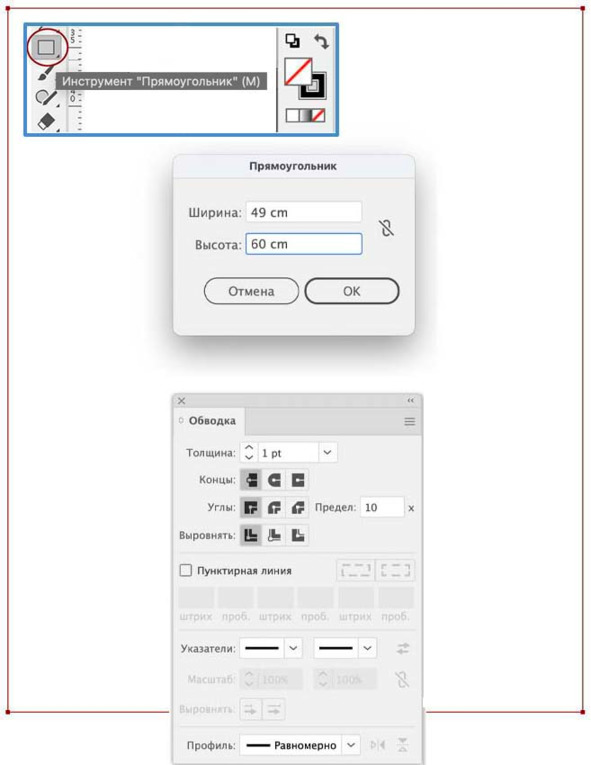 3) Кликните на монтажной области и задайте следующие параметры в диалоговом окне «Прямоугольник»: Ширина – 49 см; Высота – 60 см. Кликните на кнопку «ОК» в диалоговом окне «Прямоугольник».