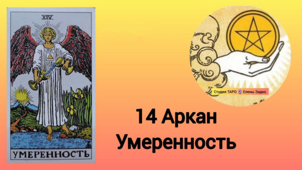 На сером фоне с ангельскими крыльями стоит умеренность, в белом платье, в его руках два золотых кубка, из одного в другой он переливает воду, правая нога в воде левая на суше, на берегу цветущие золотые ирисы позади ангела тропинка ведущая к солнцу, на груди треугольник в квадрате, от золотых волос исходят сияющие лучи.