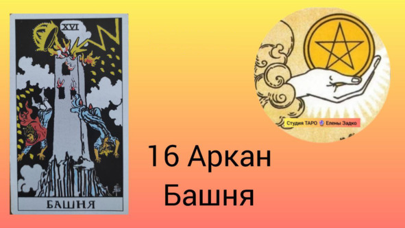 На черном фоне серая башня в огне, золотая корона свергнута молнией с небес, вниз головой падают люди.